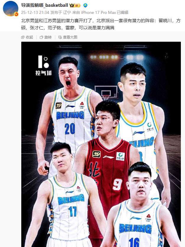 辽宁媒体人导演我躺哪也来吐槽了,“北京男篮和江苏男篮的潜力赛开打了,北京派出一套很有潜力的阵容:翟晓川,方硕,张才仁,范子铭,雷蒙,可以说是潜力满满”。