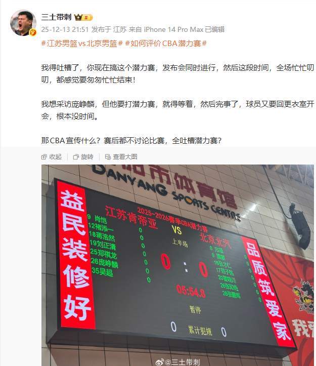 我得吐槽了,你现在搞这个潜力赛,发布会同时进行,然后这段时间,全场忙忙叨叨,都感觉要匆匆忙忙结束!我想采访庞峥麟,但他要打潜力赛,就得等着,然后完事了,球员又要回更衣室开会,根本没时间。那CBA宣传什么?赛后都不讨论比赛,全吐槽潜力赛?