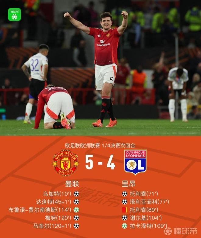 欧联1/4决赛次回合,曼联与里昂展开对决。上半场,乌加特和达洛特先后破门为曼联取得两球领先。下半场,托利索和塔利亚菲科6分钟内扳平比分,托利索随后吃到第二张黄牌被罚下。90分钟战罢,两队战平进入加时赛。加时赛,谢尔基破门,拉卡泽特点射得分。不过随后比赛进入最高潮,先是B费点球扳回一城。随后,梅努完成绝平。卡塞米罗传中,马奎尔头槌绝杀。全场比赛结束,曼联加时赛连进三球5-4逆转击败里昂,并且以两回合7-6的总比分晋级欧联4强。