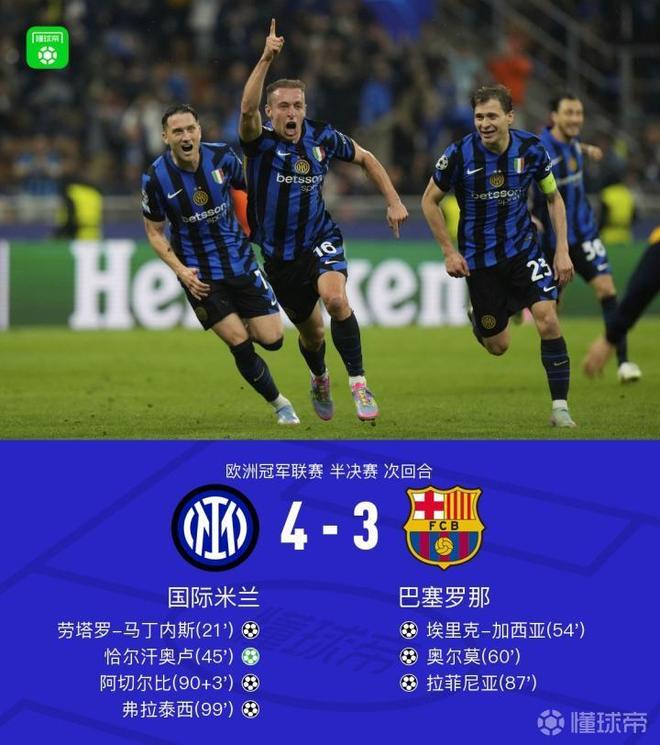 欧洲冠军联赛半决赛次回合,国际米兰与巴塞罗那展开激烈较量。上半场,邓弗里斯横传助攻劳塔罗推空门得手,劳塔罗造点后恰尔汗奥卢主罚命中;下半场,阿切尔比俯身头球入网被判越位进球无效,马丁助攻加西亚凌空垫射破门,马丁再度助攻奥尔莫头球扳平,拉菲尼亚连续两脚攻破球门逆转比分,补时阶段邓弗里斯助攻阿切尔比将比分扳平;加时赛阶段,塔雷米背身助攻弗拉泰西打远角破门。最终,国际米兰以4-3战胜巴塞罗那。两回合总比分国际米兰7-6淘汰巴塞罗那,成功晋级决赛。