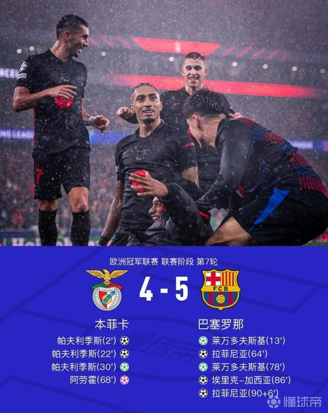 上半场,帕夫利季斯闪击得分。巴尔德造点,莱万主罚命中。随后,什琴斯尼送礼和送点,帕夫利季斯半小时戴帽。下半场,本菲卡门将开球失误,拉菲尼亚扳回一个。不过,阿劳霍随后自摆乌龙。亚马尔造点,莱万主罚破门。佩德里助攻,埃里克-加西亚头槌扳平比分。读秒阶段,拉菲尼亚完成绝杀。全场比赛结束,巴萨在一场戏剧性的比赛中客场5-4逆转击败本菲卡。